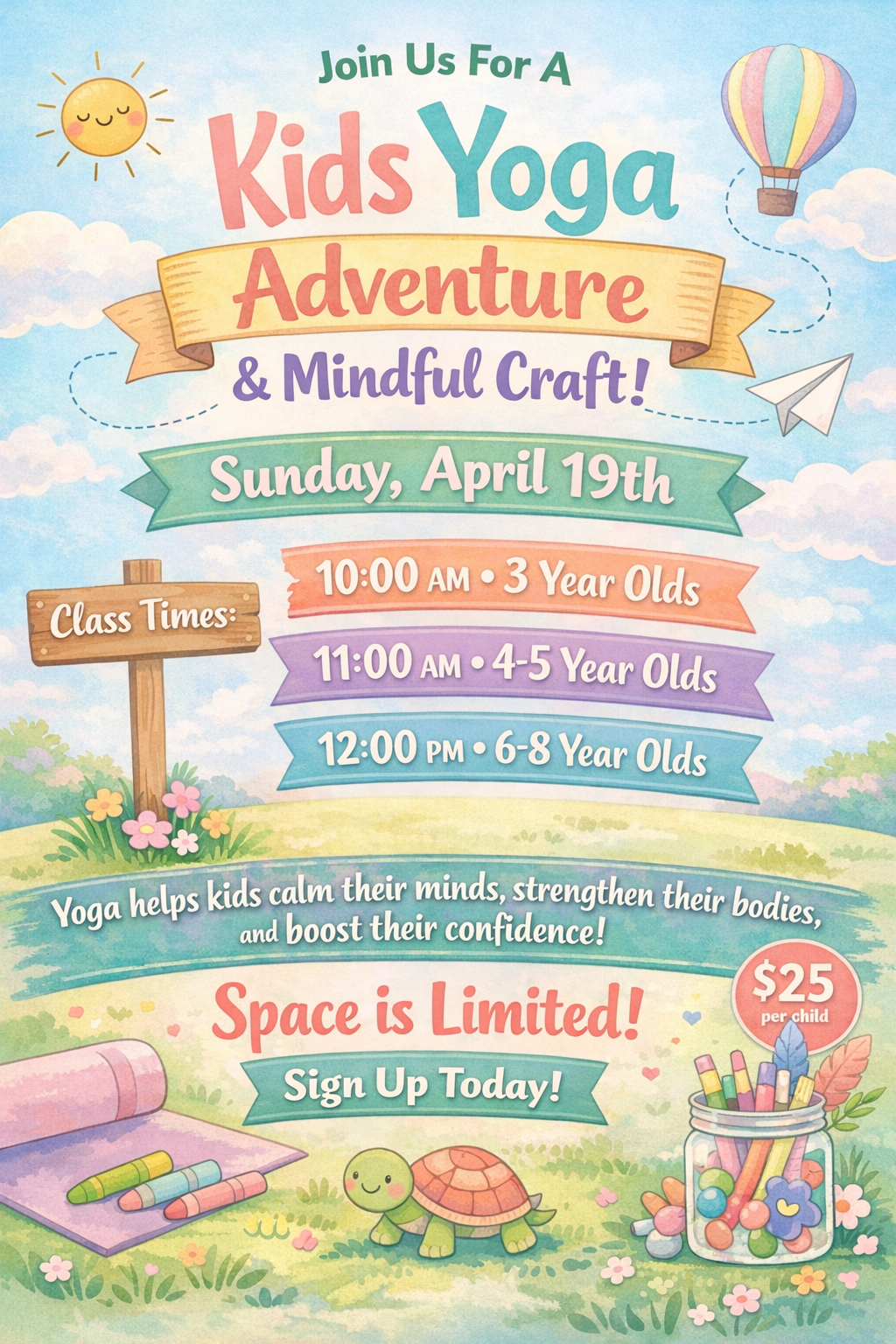 Children will explore yoga poses through a structured but playful flow that encourages strength, flexibility, and confidence while introducing age-appropriate mindfulness practices.